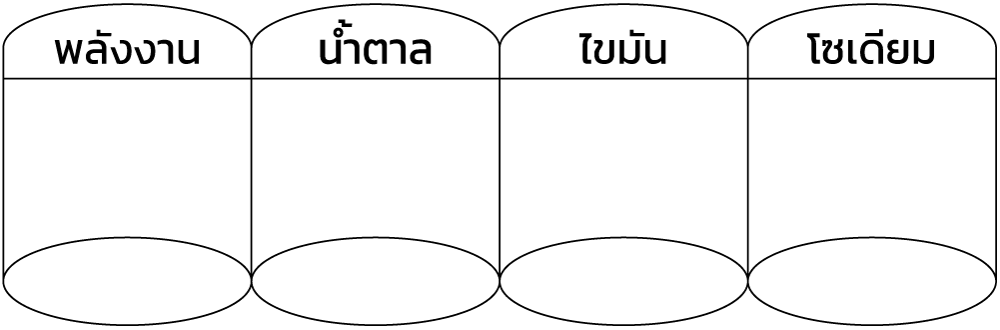 พลังงาน (กิโลแคลอรี่) ต่อกรัม : ไขมัน = 9 ; โปรตีน = 4 ; คาร์โบไฮเดรต = 4