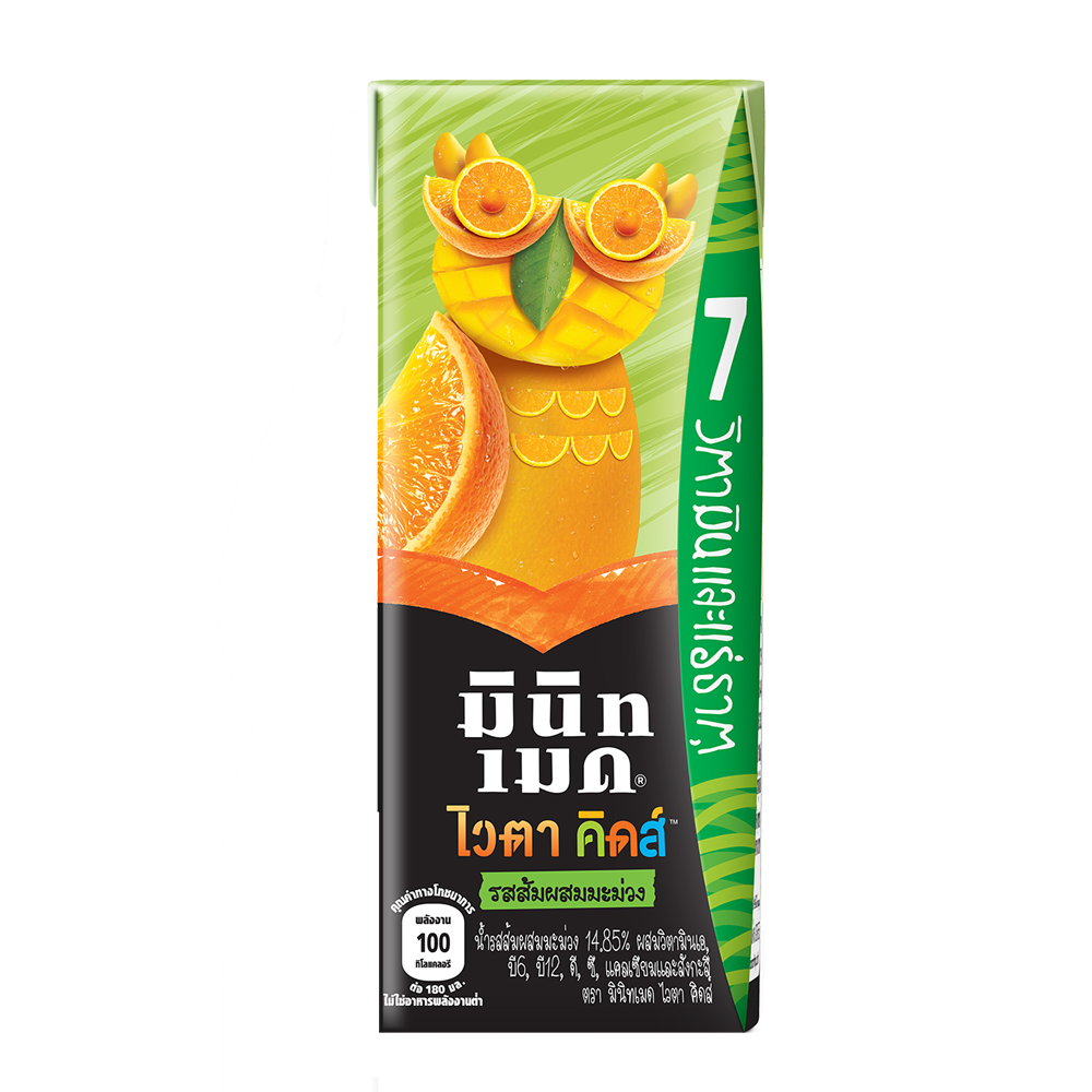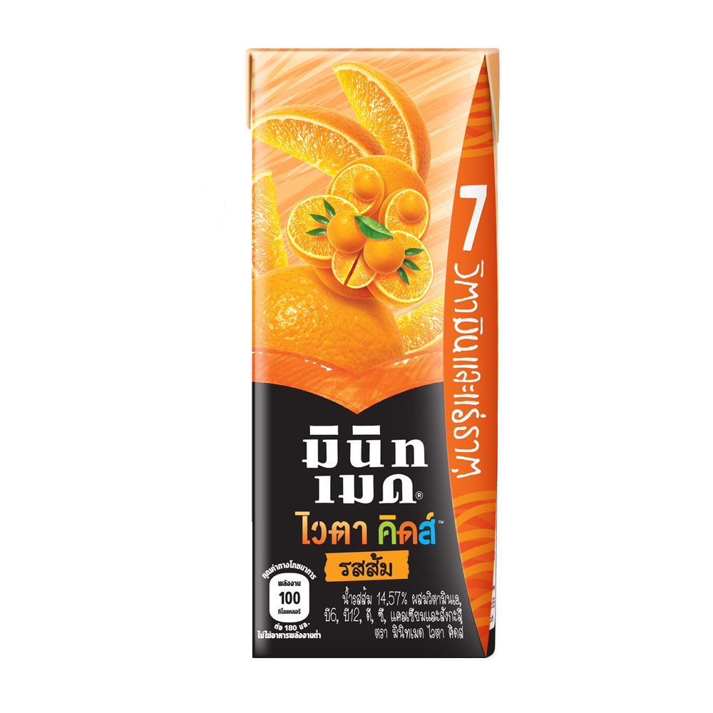น้ำรสส้มผสมมะม่วง 14.85% ผสมวิตามินเอ,บี6, บี12, ดี, ซี, แคลเซียมและสังกะสี ตรามินิท เมด ไวตา คิดส์