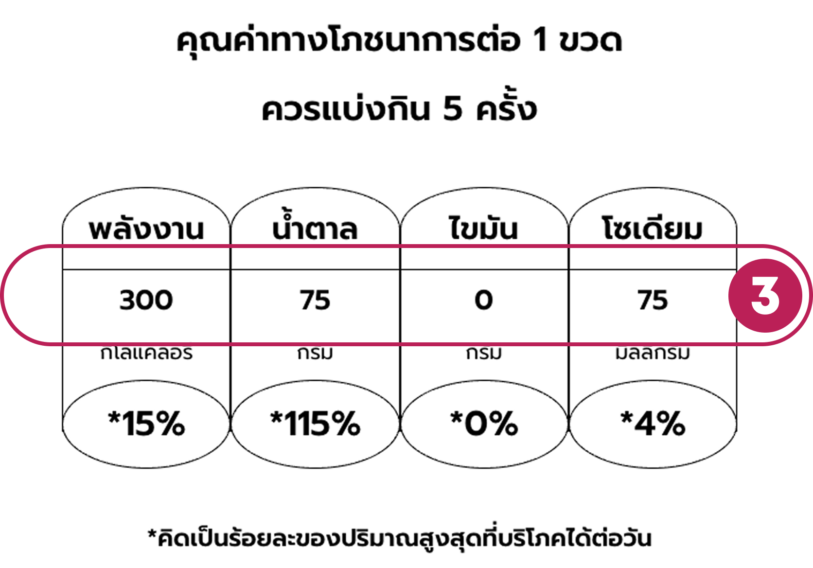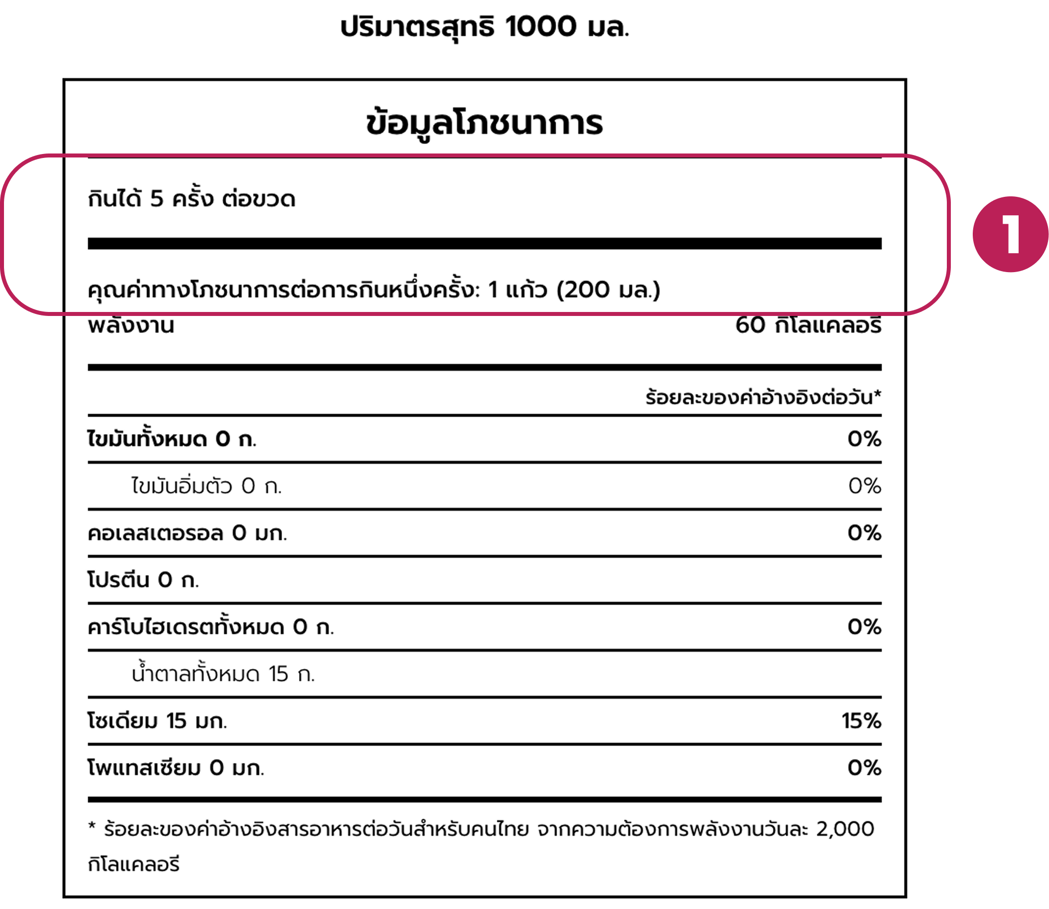 ตัวอย่างเช่น เครื่องดื่มที่มีปริมาณ 1,000 มล. ควรแบ่งกิน 5 ครั้ง ครั้งละ 1 แก้ว (200 มล.)