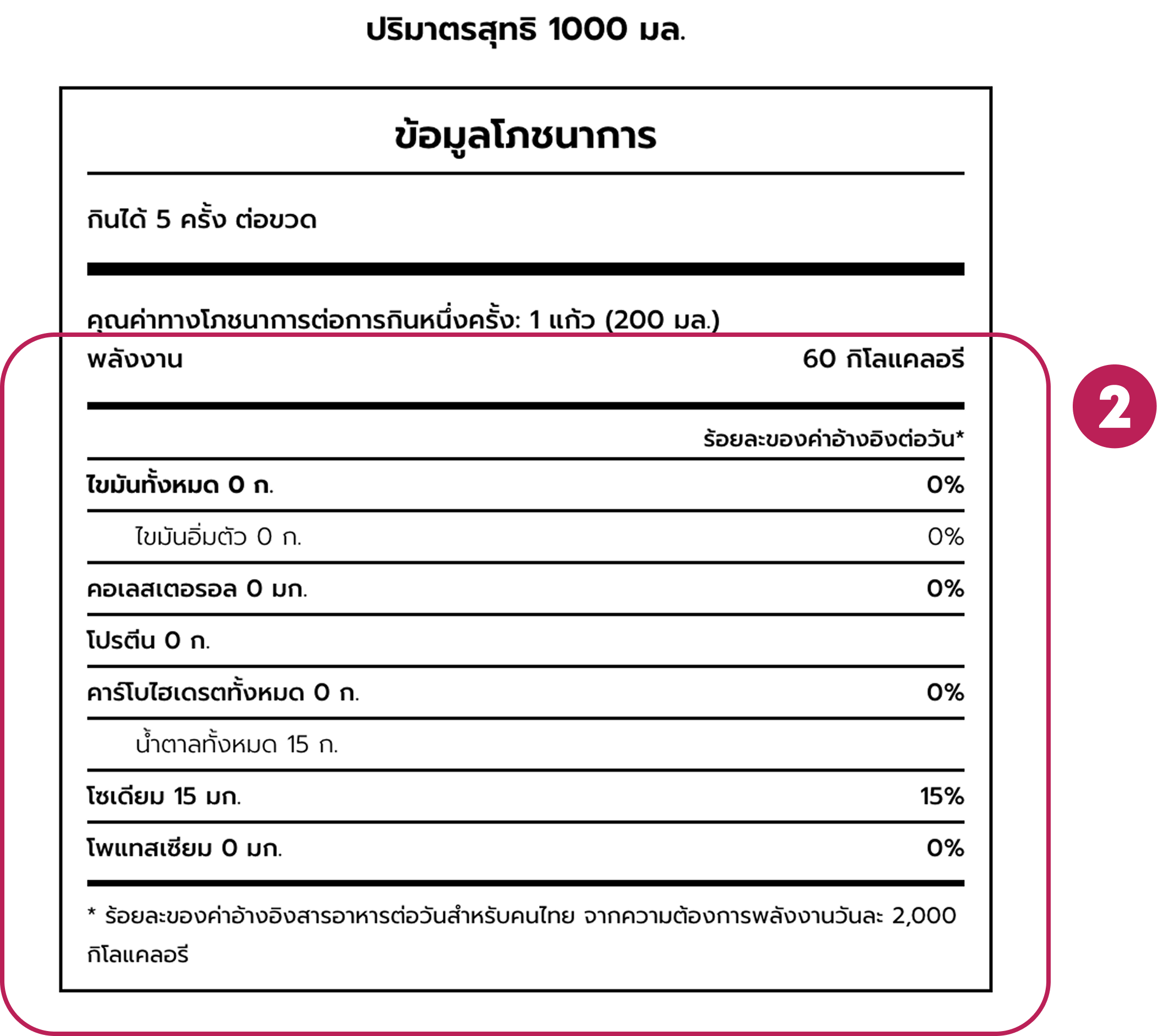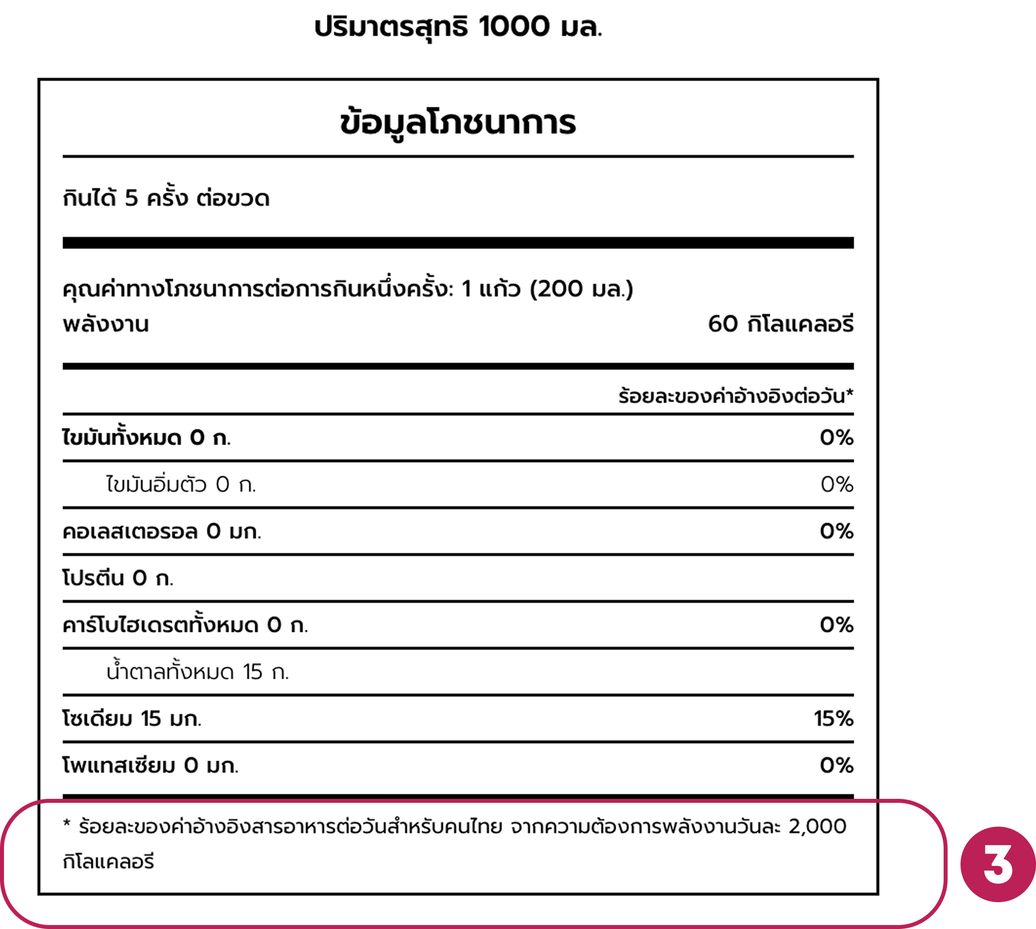 แสดงปริมาณพลังงาน น้ำตาล ไขมัน และโซเดียม เป็นร้อยละเมื่อเทียบกับ ปริมาณของสารอาหารที่แนะนำ ให้บริโภคต่อวันสำหรับคนไทย อายุตั้งแต่ 6 ปีขึ้นไป (Thai rec- ommended daily intakes หรือ Thai RDI) เพื่อช่วยให้ทราบว่า เมื่อบริโภคผลิตภัณฑ์ทั้งภาชนะบรรจุ จะได้รับพลังงาน น้ำตาล ไขมัน และโซเดียม ในสัดส่วนที่เทียบกับ ปริมาณสูงสุดที่บริโภคได้ต่อวัน