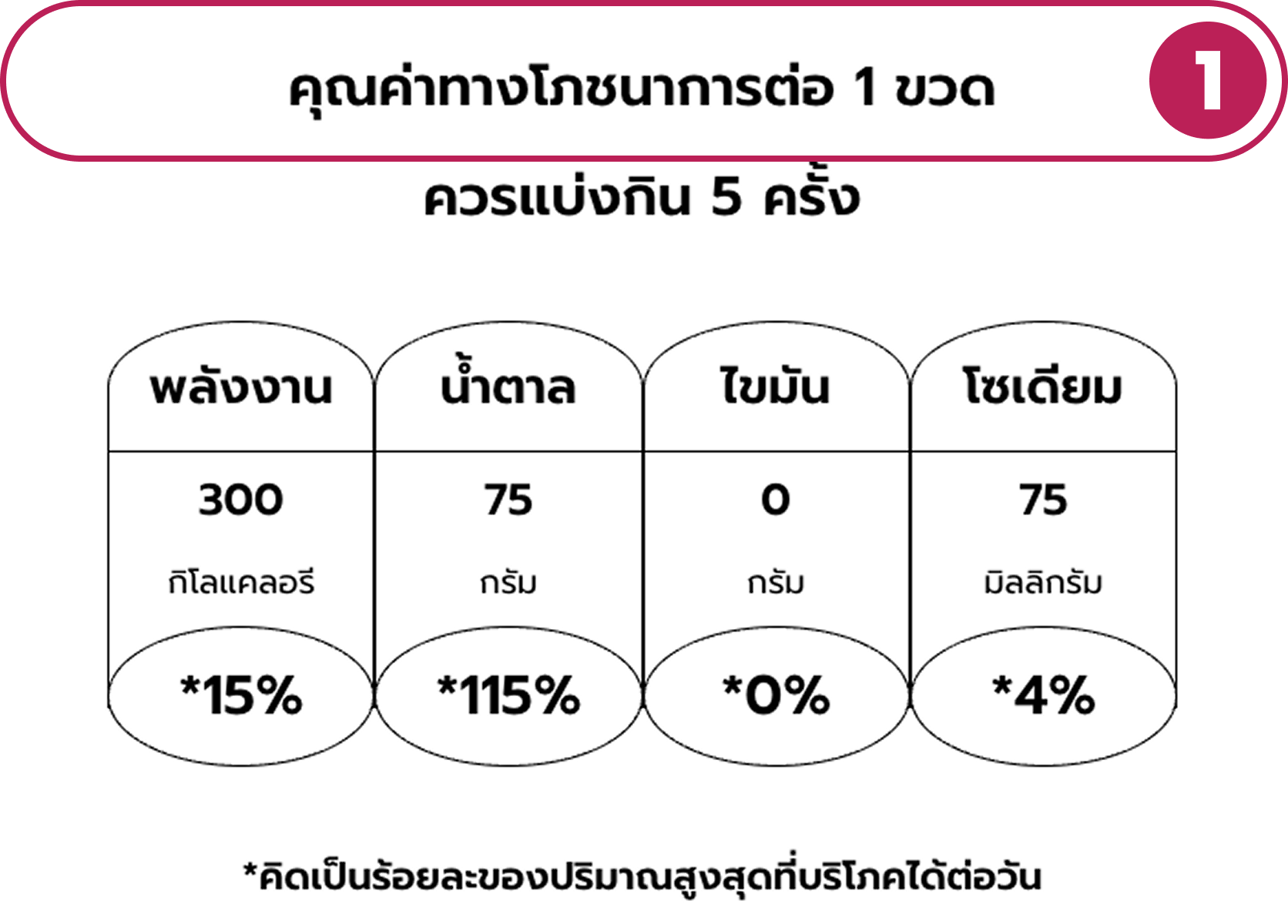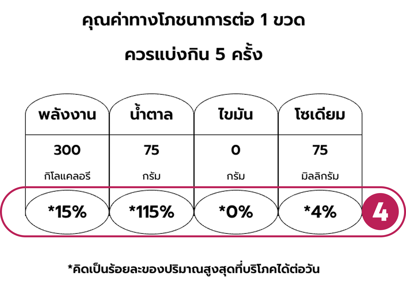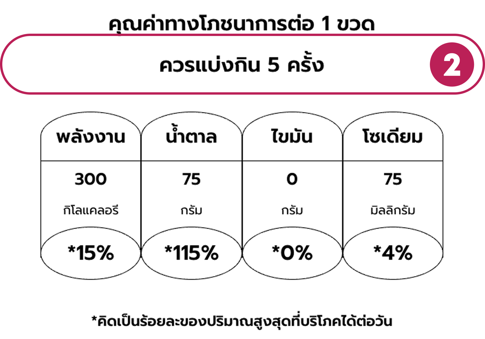 - หากดื่มจนหมดในครั้งเดียว จะได้รับพลังงานร้อยละ 15 น้ำตาลร้อยละ 115 ไขมันร้อยละ 0 โซเดียมร้อยละ 4 ของปริมาณสูงสุดที่ควรได้รับในแต่ละวัน